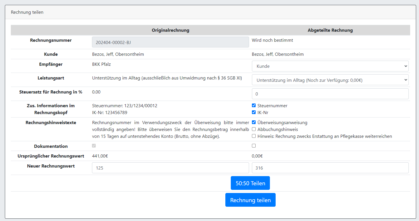 Rechnungen können jetzt mit wenigen Klicks beliebig geteilt werden, was den Zuschnitt zu verfügbaren Budgets deutlich vereinfacht.